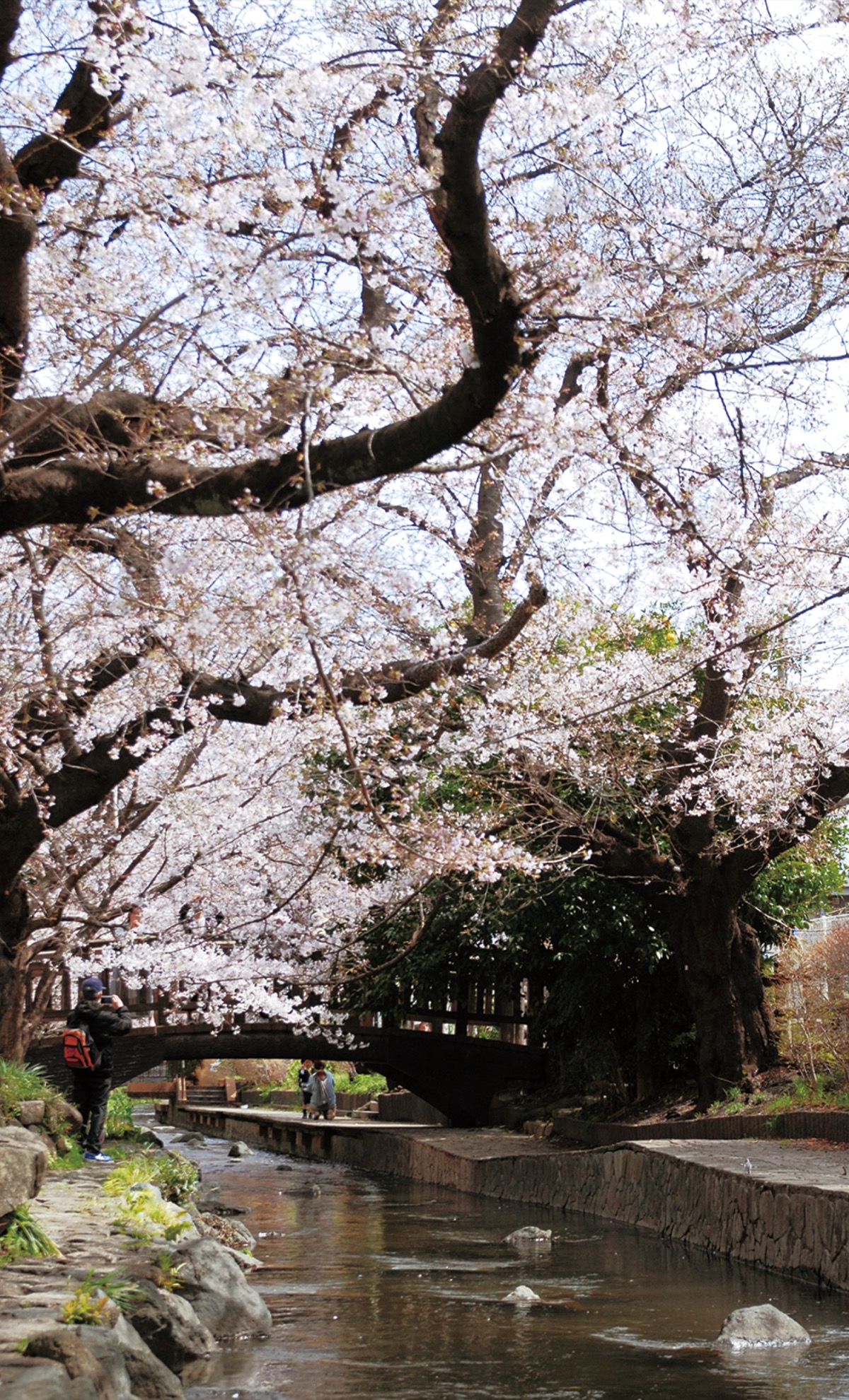 二ヶ領用水宿河原堀の桜並木が見頃を迎えている。同地区で初めて植樹されてから60年あまり。2キロほどの距離に、約400本の桜が今年も水辺を彩る。