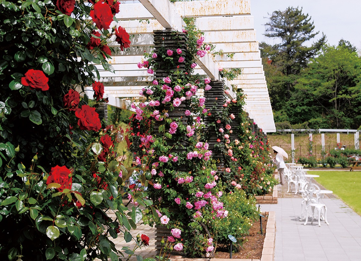例年、春と秋に一般開放をする同苑。特に春は約800種類・約3300株と、より多くのバラが花をつける。大輪や四季咲き中輪、ミニバラのほか、柱に沿って咲く「つるバラ」は春ならではの見どころ。