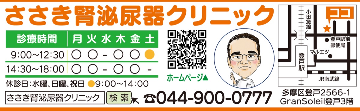 小田急線登戸駅徒歩2分の場所に5月6日(木)、「ささき腎泌尿器クリニック」が開院する。聖マリアンナ医科大学病院腎泌尿器外科で23年にわたり臨床・教育・研究を行ってきた佐々木秀郎院長は「より患者さんに近い場所で診療を行いたいと考えました。気楽な気持ちで相談できるクリニックを目指しています」と思いを語る。