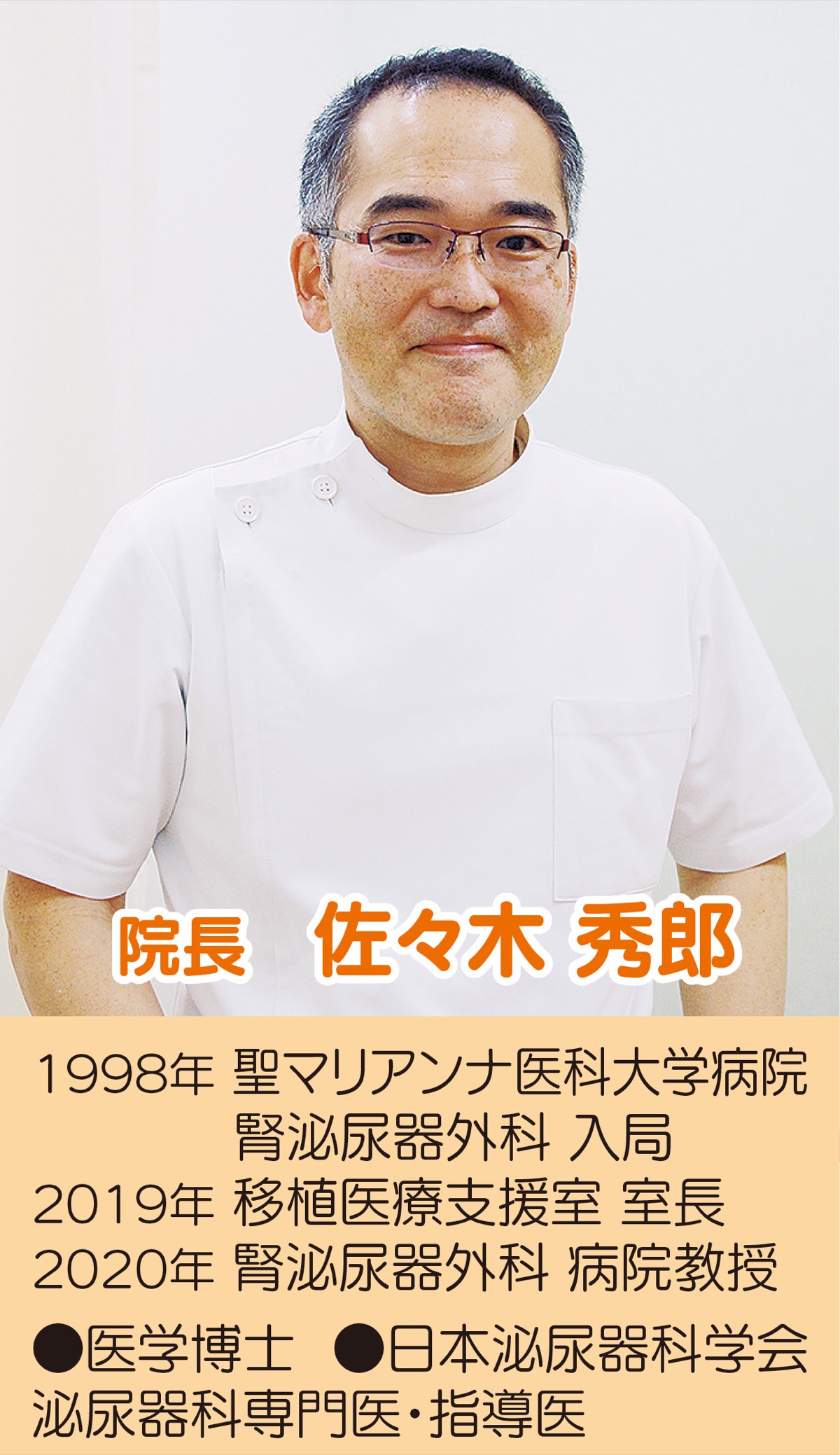 女性も来院しやすいよう、院内は女性専用のトイレや広い待合室を整備。膀胱鏡や尿流用測定装置は大学病院と同等の機器をそろえている。聖マリアンナ医科大学の客員教授のほか、川崎市立多摩病院の登録医としても診療を続ける佐々木院長は「泌尿器科専門医・指導医として、全般の知識のみならず、豊富な腎移植の経験も生かして腎臓のお悩みにも応えていきます。少しでも気になることがあれば気楽にお電話ください」と話す。