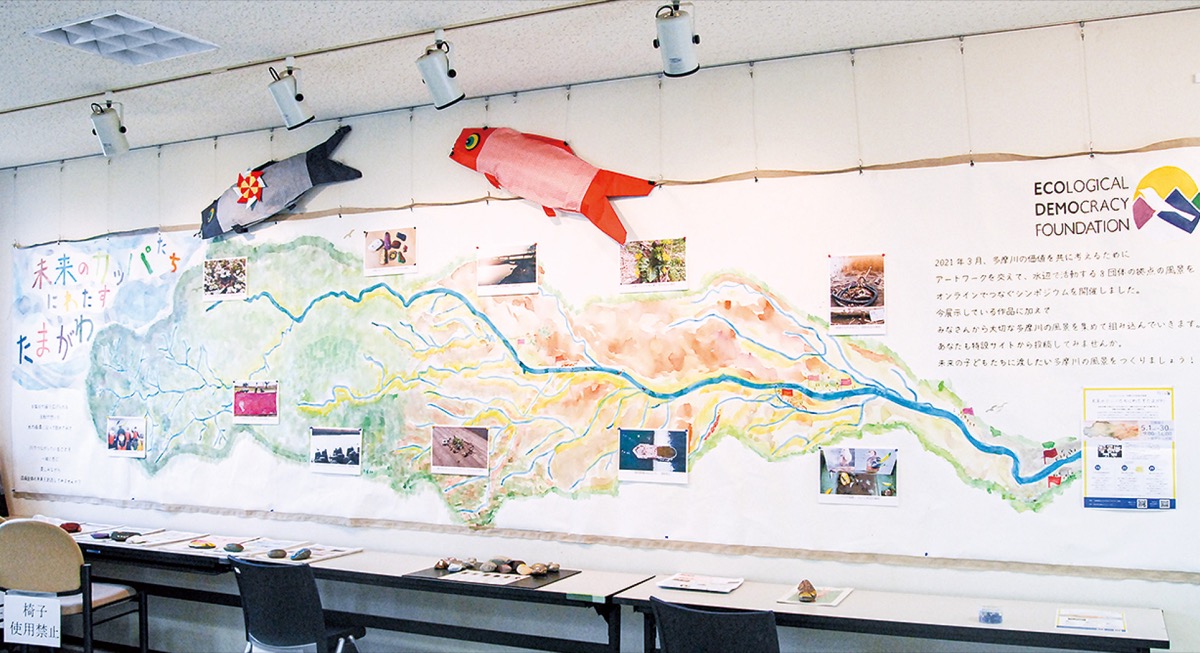 同展示は多摩川流域の活動を調査する一般財団法人エコロジカル・デモクラシー財団が企画。多摩川の未来を考えるきっかけにしようと、幅6メートルの流域地図に各地にまつわるアート作品の写真を掲示してきた。