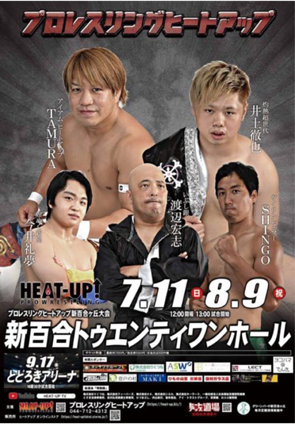 菅北浦に道場を構えるヒートアップには、大型若手ファイターの井土徹也選手(21)や昨年12月にデビューした今井礼夢選手(16)、SHINGO選手(35)ら個性豊かなレスラーが所属。9月17日(金)には「とどろきアリーナ大会」が控えており、各選手のこれからの戦いぶりに注目が集まる。