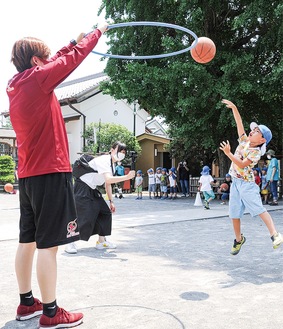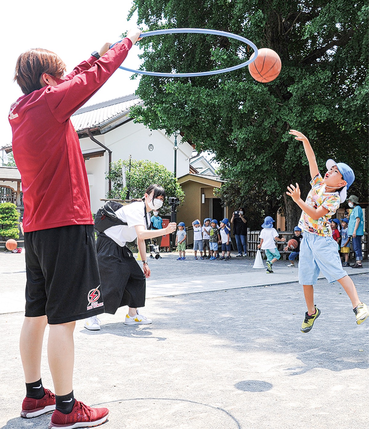 参加した齊藤結已(ゆい)君(5)は「シュートが楽しかった」、吉田咲菜(さな)さん(5)は「もらったゴールで遊んでみたい」と感想を話した。小林史子園長(69)は「子どもたちがバスケという未知のことを経験できてよかった。将来、選手が育ってくれたらうれしい」と思いを語った。