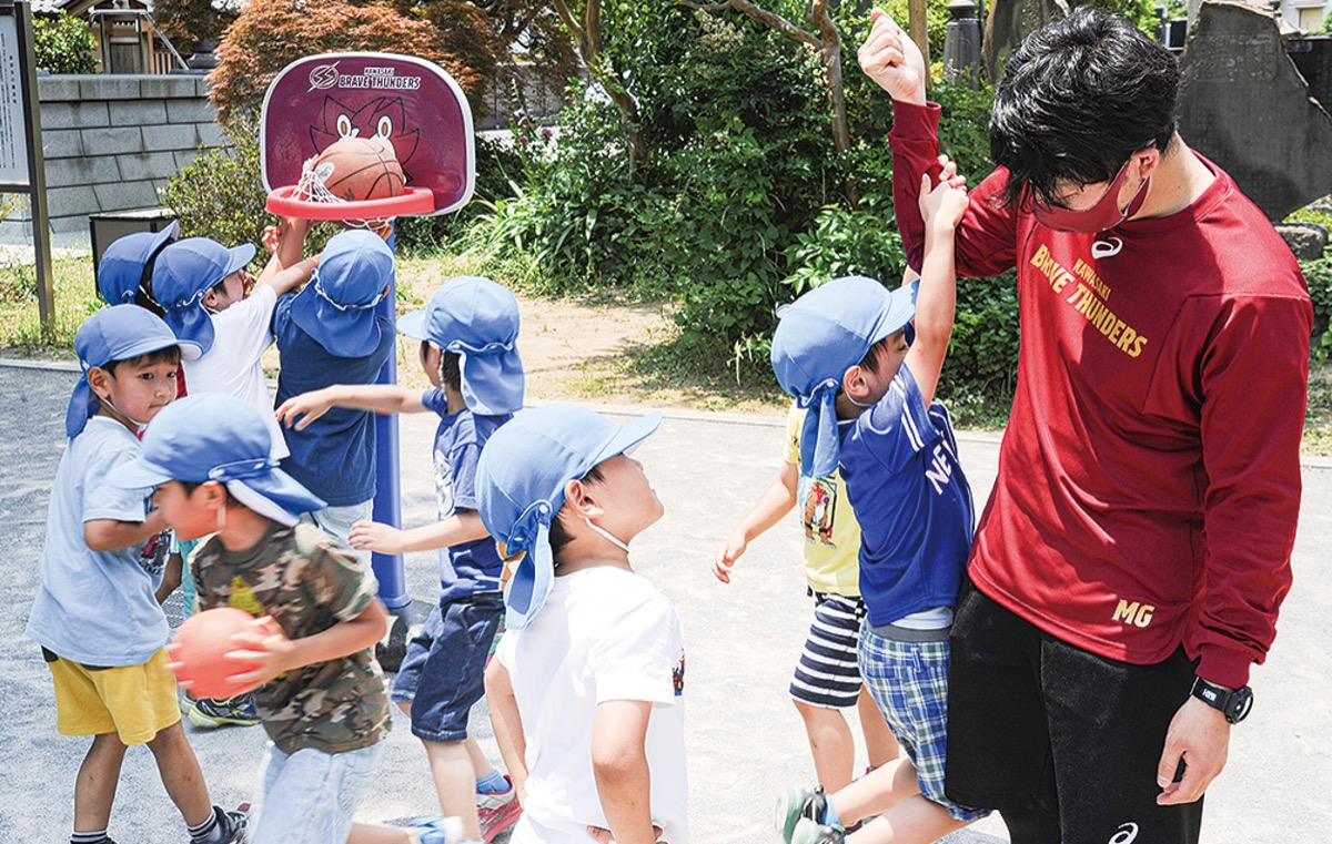 一般財団法人川崎市保育会はバスケットボールB1・川崎ブレイブサンダースと連携し、子どものボール遊びをテーマにした保育士向け研修動画の制作に着手。6月10日には、稲田保育園(登戸)で同クラブによる園児のバスケ体験教室を開き、撮影を行った。研修動画は今年夏ごろの公開を目指す。