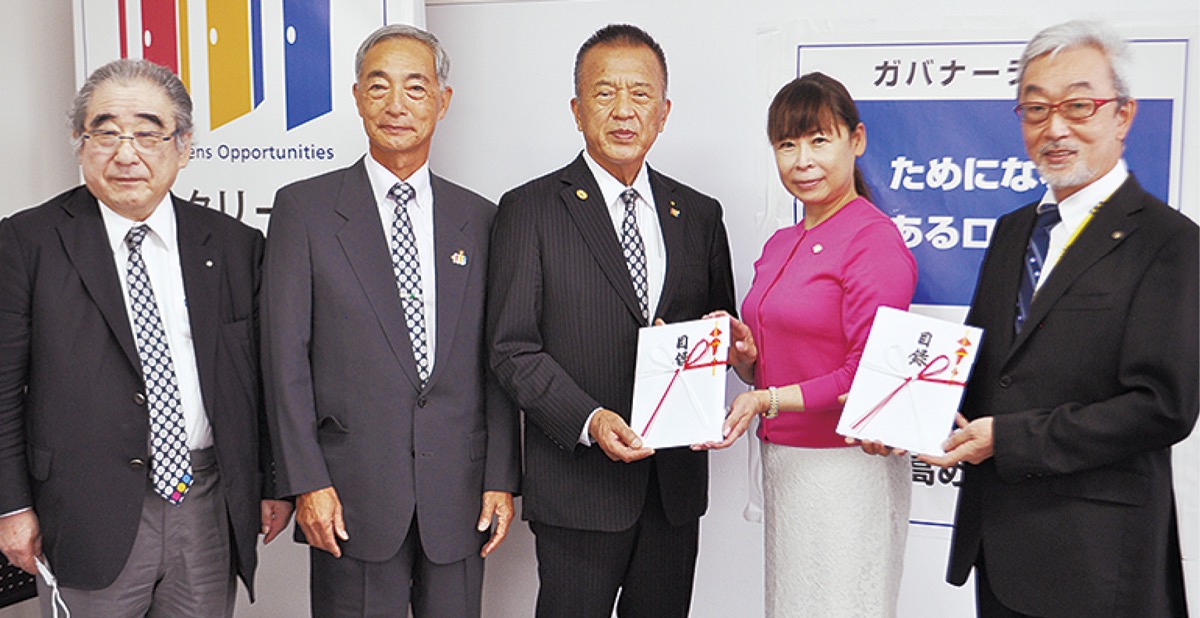 ガバナー事務所(横浜市中区)で行われた贈呈式には、川崎市医師会の岡野敏明会長(登戸・岡野内科医院)と横浜市医師会の川越理香常任理事らが出席。吉田ガバナーは新型コロナ対応に尽力する医療従事者に向けて感謝の言葉を述べ、ロータリー財団委員長の露木雄二さんは「医療現場でぜひ役立てていただけたら」と語った。フェースシールドは首にかけて使うタイプで、下向きの飛沫を防ぐ最新式のものだという。両医師会は「私たち医療従事者だけでなく患者への安心感にもつながる。有効に活用したい」と感謝を表した。