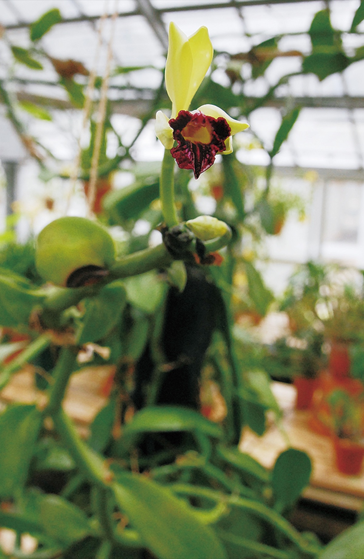 熱帯地域で栽培されるラン科の植物で、茎をつる状に伸ばすバニラ。花は一輪ずつ徐々に咲き、一日花だという。果実を発酵させるとバニラ・エッセンスになる。