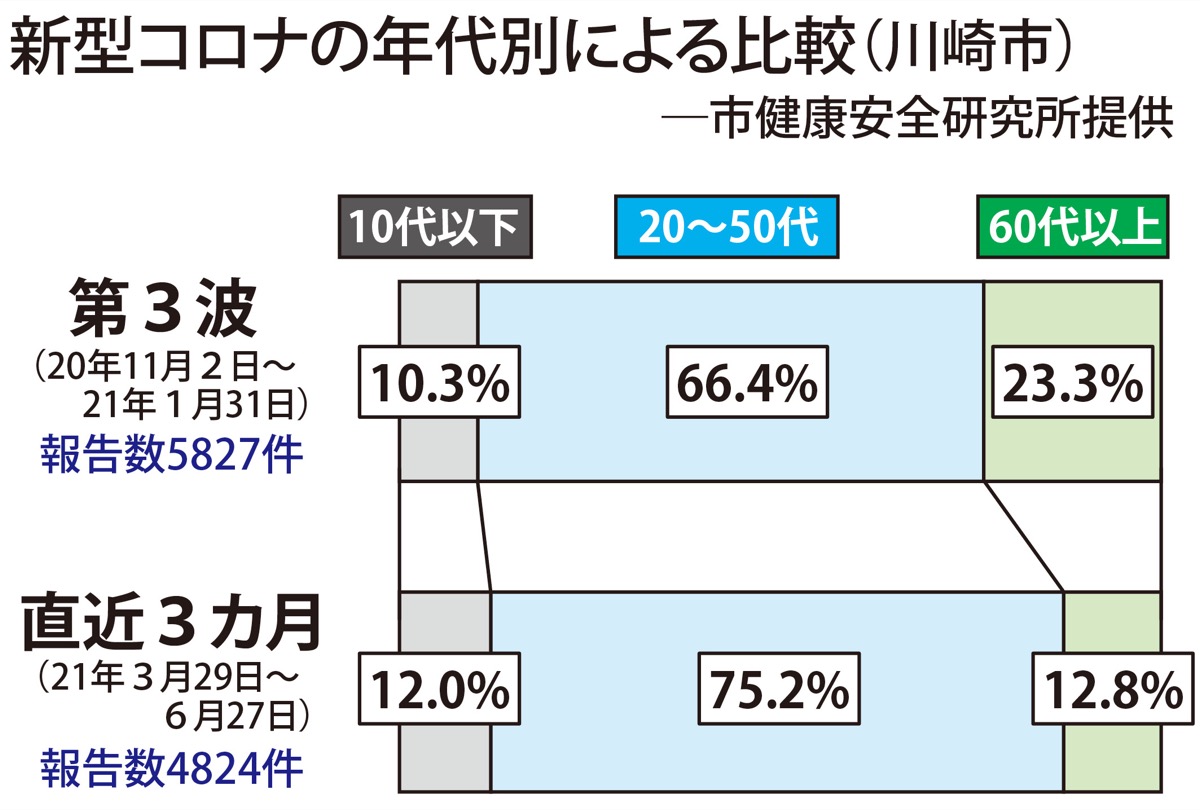 第3波にあたる2020年11月2日〜21年1月31日の60歳以上の割合は23・3%だったが、直近3カ月(3月29日〜6月27日)は12・8%だった。高齢者を対象にワクチン接種が始まったのが5月。6月28日時点で、65歳以上の63%が1回目、24%が2回目の接種を終えている。