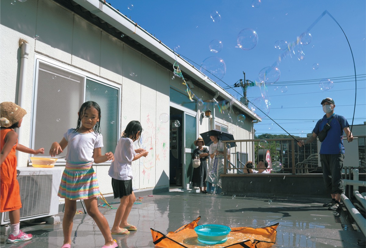 スミさんらの依頼を受け、同店を運営する銀座ホールディングスの倉方規安社長(44)が閉店前の屋上スペースを5月から提供。3回目の「まちカフェ」となったこの日は、多摩区を拠点に「シャボン玉オヤジ」の名で活動する男性も参加した=写真上。地元住民ら十数人が集まり、水遊びやお絵描き、スイカ割りに興じた。「なくなってしまう空間で楽しく終わりを迎えられたら」とスミさん。倉方社長は「公園など遊び場が少ない今、まちの方々が求めているのであればと思った」と胸中を明かした。