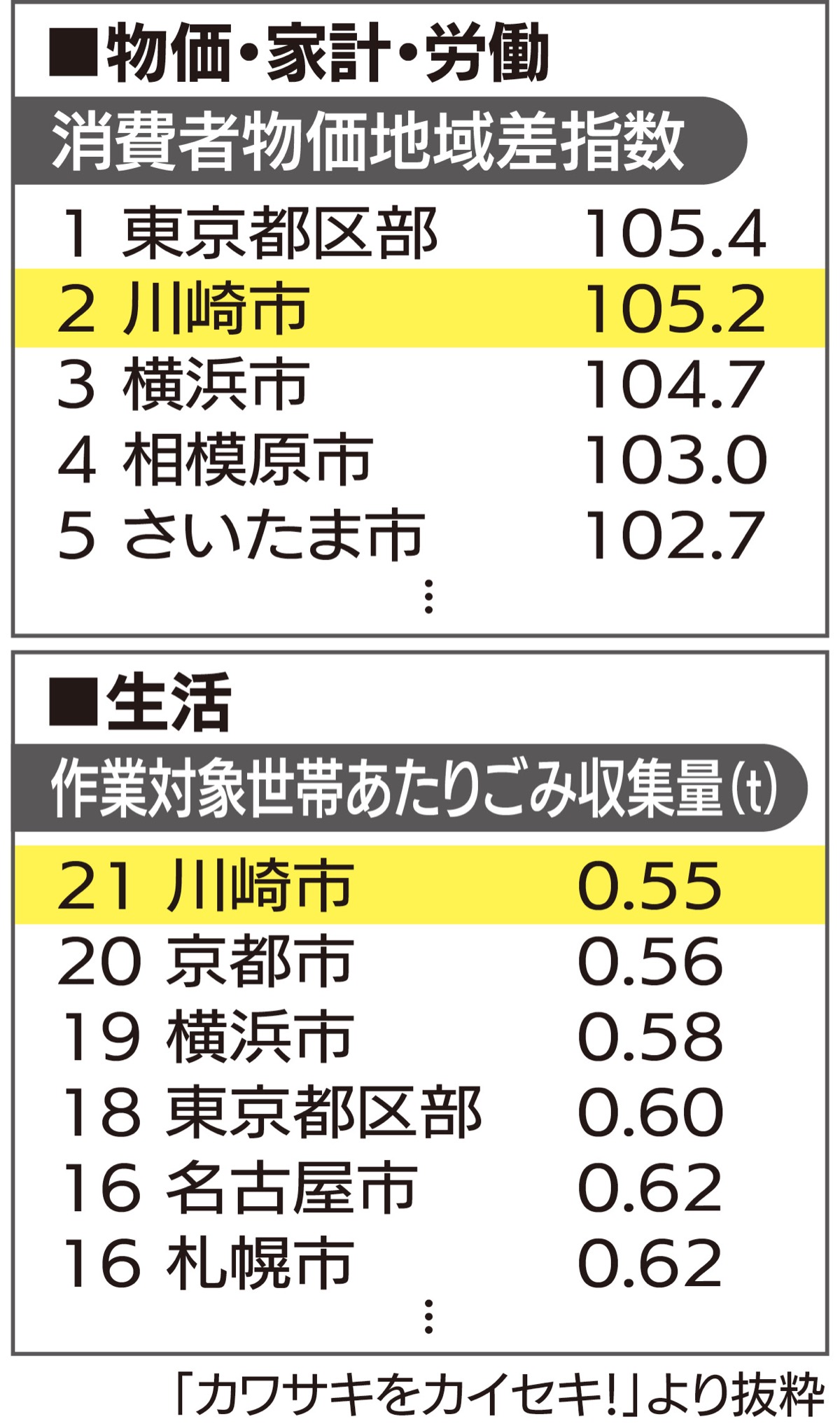 川崎市は、21大都市(政令指定都市と東京都区部)の基礎的な統計を比較し、ランキング形式でまとめた冊子「カワサキをカイセキ!」(令和元年版)を先月発行。地域の物価水準を数値化した指数(消費者物価地域差指数)が、政令指定都市の中で最も高いことが分かった。