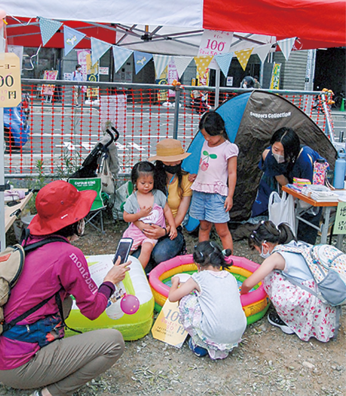 この日は「たまくママのわ(仮)」として、共に3児の母親の楠部静代さん(41)、中村ふみよさん(39)がヨーヨーすくい等で出店。多摩区で子育てママのコミュニティをつくろうと、来場した親子と言葉を交わした。「多摩区に住んで5年目。育休中のママさんなど子育てでつながる居場所をつくりたい」と楠部さん。中村さんは「今まで地域に関わったことがないママさんたちと一緒につくっていけたら」と思いを話した。
