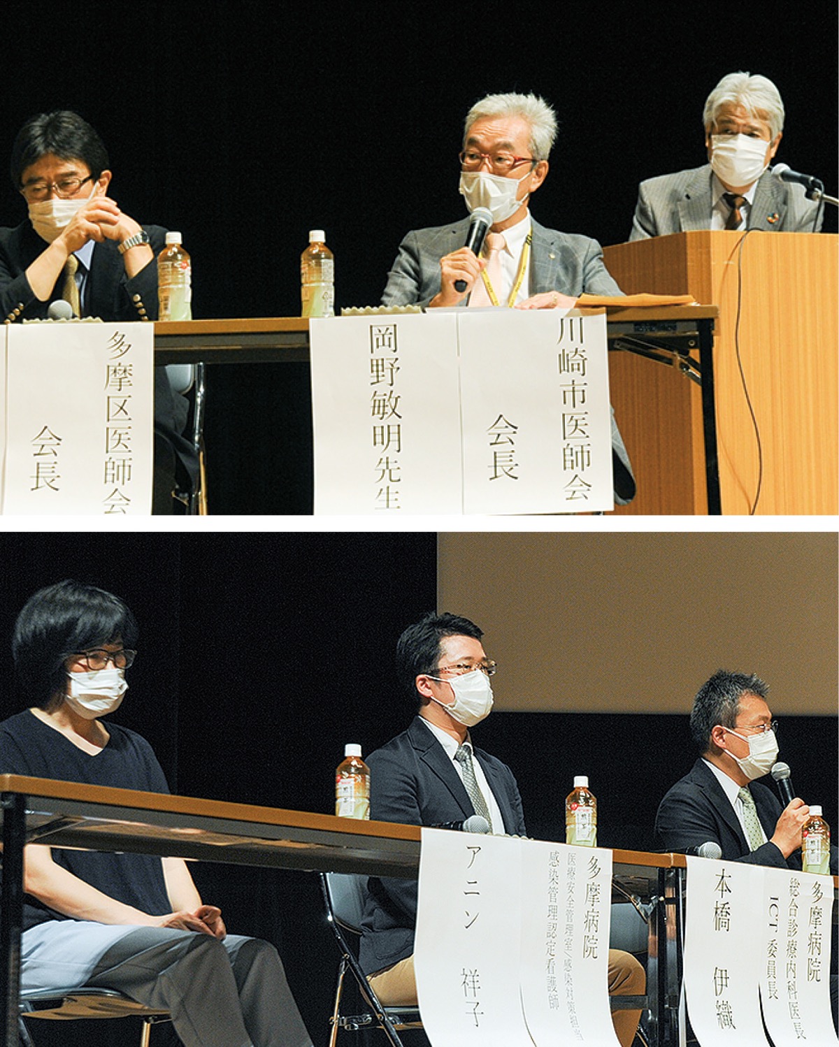 登壇者は他に、基調講演も行った聖マリアンナ医科大学感染症学の國島広之教授、多摩病院総合診療内科医長でICT委員長の本橋伊織さん、同院医療安全管理室・感染管理認定看護師のアニン祥子さん。同院の「登録紹介医の会」として、区内外の医師ら40人以上が参加した。