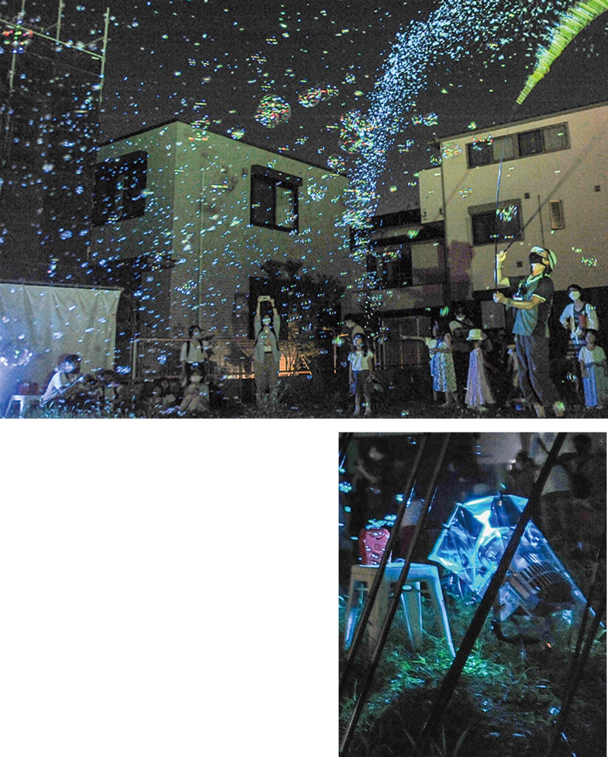 ナイトバブルは、区画整理下の地域振興に取り組む「登戸まちなか遊縁地」実行委員会が、関係者のみで先月28日に小規模開催した企画の一つ。夜の空き地で齋藤さんはLEDライト4台を設置し、青や赤など10種類近い色が自動で切り替わるよう設定。音楽と共に、シャボン玉オヤジが飛ばす大小さまざまなシャボン玉に多彩な光が混ざり、約30分にわたり幻想的な空間が広がった。