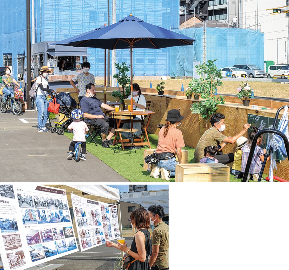 会場では道路空間の利活用イメージを体感してもらおうと、キッチンカーや多摩図書館リユース本の本棚、ハンモック、ベンチなどを感染対策のもと設置。23日、区内から息子の京弥君(3)と訪れた中曽根千景さん(41)は「SNSで見つけて来てみたが、2号線は初めて知った。一息つける休憩スポットやカフェができたらうれしい」と感想を話した。