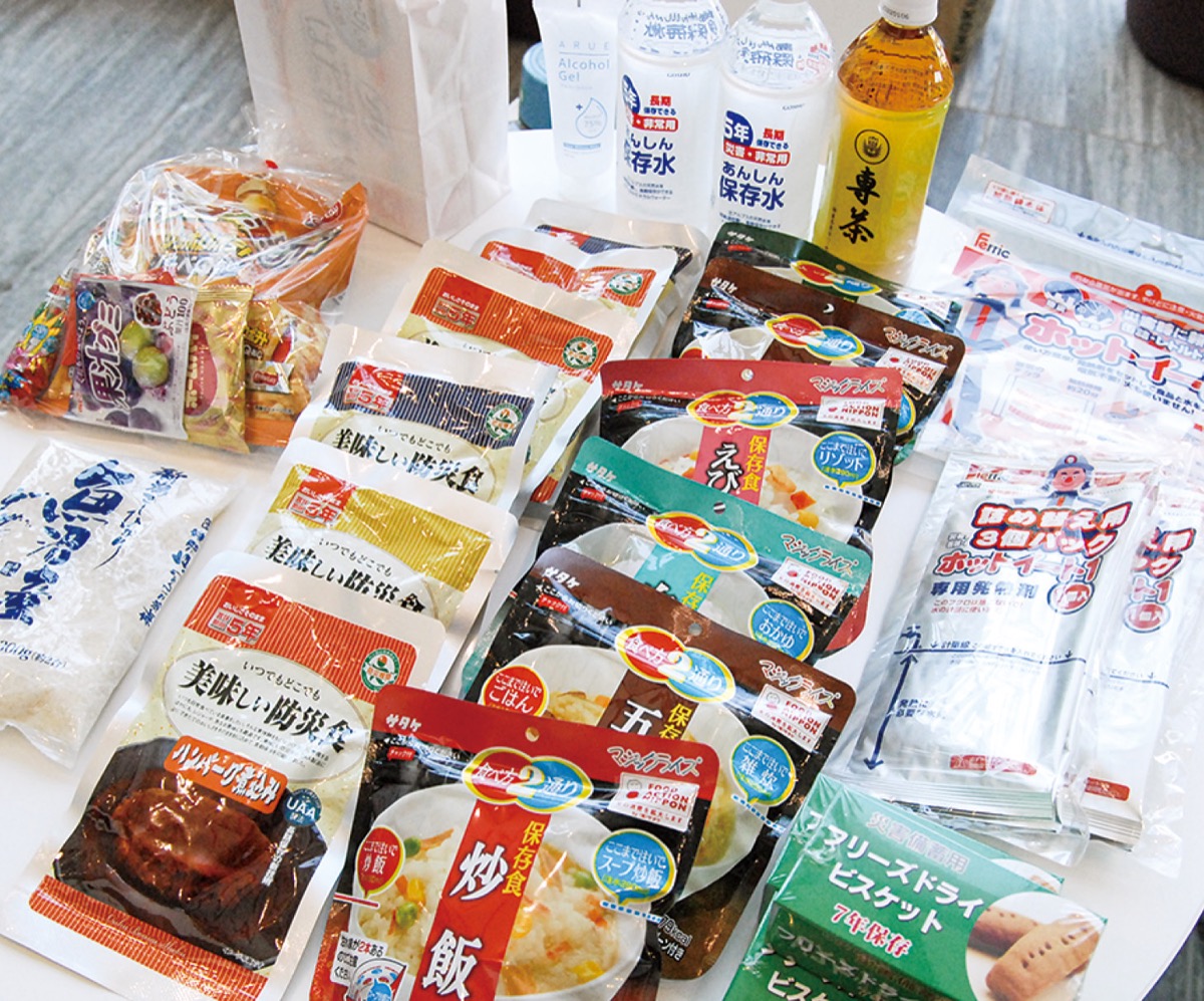 同プロジェクトでは、東京・神田キャンパスの150人分と合わせて計450人分の食料品等を準備。約3日分のレトルト食品や米、菓子などが袋に詰められ、ほかに生理用品も用意された。