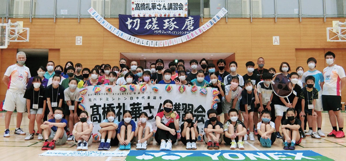 コロナ下で部活動などが制約される中、次世代の選手に明るい未来を見出してもらおうと、川崎市バドミントン協会が主催。感染対策のもと、市内クラブ等に所属する小中学生46人、指導者ら45人が参加した。高橋さんら講師3人が実技指導を行い、質問コーナーや写真撮影などで交流する場面もあった。