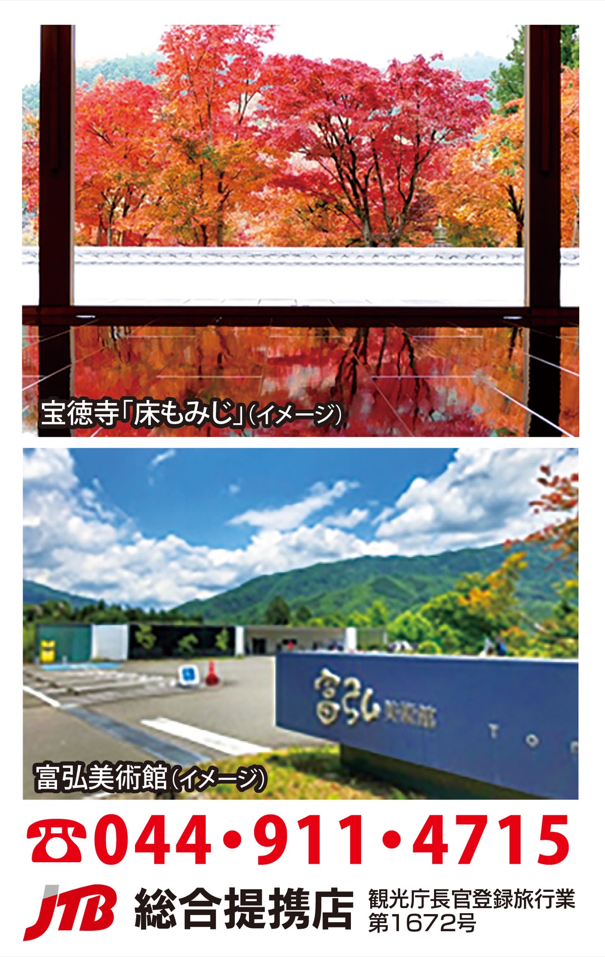 大人気の地元発着・日帰りバスツアーで群馬県へ。100本以上のもみじが紅葉する宝徳寺で、床に映る「床もみじ」を堪能。詩画作家・星野富弘氏の作品を美術館で鑑賞し、高津戸峡で散策を。▼出発日/11月22日(月)、24日(水)、25日(木)▼出発地と時間/登戸駅多摩川口に午前7時20分▼代金/1万3千円(昼食付・子ども同額)