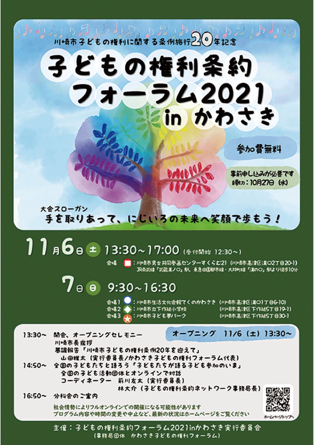 6日は男女共同参画センター「すくらむ21」でオープニングイベントを開催する。山田代表による基調報告や、全国の子ども活動団体とのオンライン対話を予定。午後1時30分〜5時。7日はてくのかわさき、市立下作延小学校、川崎市子ども夢パークで分科会を開催。テーマは「こども食堂」「外国につながる子どもの権利」など22項目。かるたやすごろくで遊びながら学ぶ企画も。分科会により時間が異なり、午前9時30分〜11時30分、午後1時〜3時。