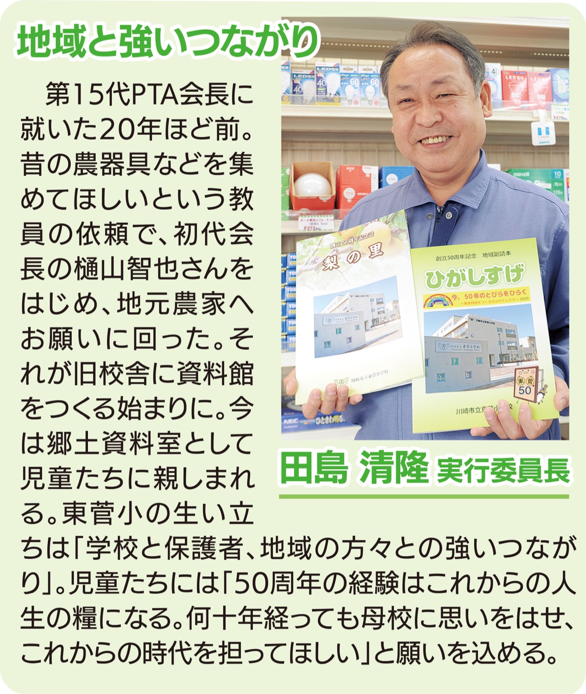 後半の2部は「東菅の原点を感じて」と題した、50年の歴史を振り返る動画をオープニングで放映。学年ごとに、日頃のテーマ学習をまとめた発表を歌や寸劇、踊りなどの演出を交えて披露した。5年生は理科で育てたカボチャでオリジナルのお菓子を作ろうと、中野島のケーキ屋とコラボし商品化。1年生は学校内を探検し、お気に入りの場所を発表。その一つ、郷土資料室の管理を担い、出前授業などを行うボランティアの佐藤行教さん=人物風土記で紹介=に感謝を込めた。2年生はまち探検を通じて見つけたおすすめの場所や人物に触れ、4年生は薬師堂や菅の獅子舞など地域の伝統・文化にスポットを当てた。3年生は地元農家の協力で育てた校内農園のナシを紹介。6年生は田島さんやPTA会長の大塚高道さんらにインタビューし、再発見した地元の魅力を伝えた。児童が作詞・作曲した「50周年の歌」の合唱も披露された。