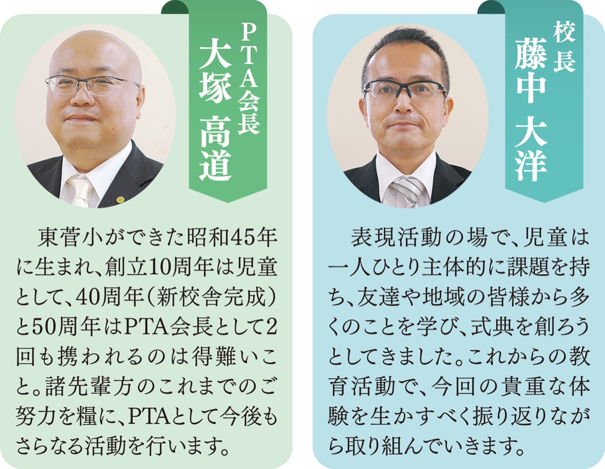 創立50周年を迎えた川崎市立東菅小学校(藤中大洋校長・児童数555人)は11月6日、アリーナで記念式典を開いた。コロナの影響で、昨年度に行われる予定だった式典を一年遅れで実現。地域の協力者や学校関係者を前に、全校児童が各々の視点で「東菅」の魅力を表現した。