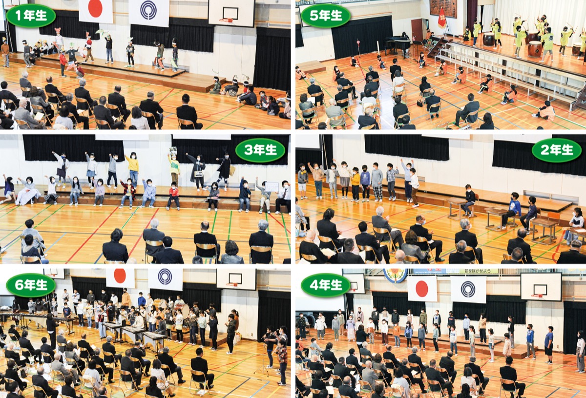 40周年のスローガンは「個性かがやく一等星 あいさつの種を植えて笑顔の花を咲かせよう」。トーンチャイム演奏や校歌斉唱のオープニングに続き、「祭り」をテーマにした太鼓や踊りを5年生が披露して開幕。1年生は校内を探検して見つけた場所や教員の魅力を紹介した。まち探検を題材にした2年生は「せかい たからもの大会」と題した寸劇を行い、地元の宝物として妙楽寺や等覚院を説明。審査員に扮した児童が迫真の演技を見せる一幕もあった。