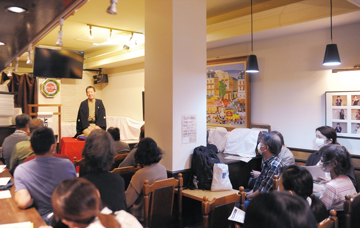 喫茶店を無料開放し、落語を楽しんでもらう一日限りの特別公演「るぐらん寄席」が、今月20日に開催。20人以上が訪れ会場は笑いに包まれた。