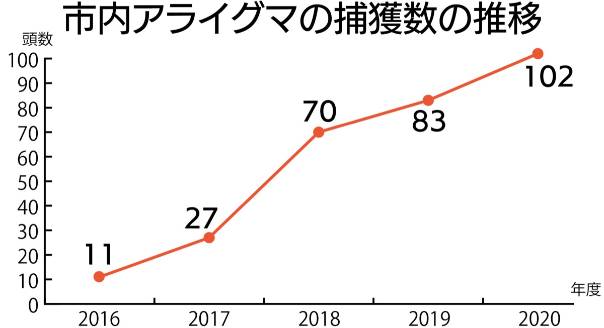 市は神奈川県が2016年に策定した「第3次神奈川県アライグマ防除実施計画」に基づき、積極的に捕獲を推進。その結果、16年度に11頭だった捕獲数は、20年度には102頭(麻生区45頭、多摩区23頭、高津区17頭、宮前区14頭、川崎区2頭、中原区1頭)まで増加した。