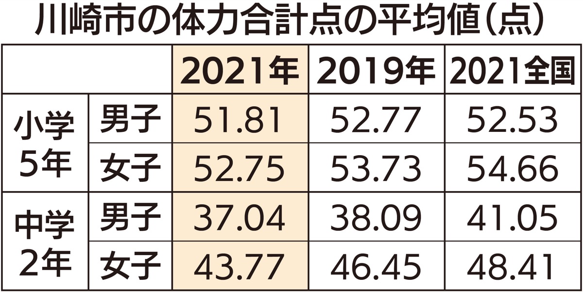 川崎市は先月、小学5年生と中学2年生を対象にした2021年度「全国体力・運動能力、運動習慣等調査」の結果概要を公表。体力合計点の平均数値は、男女共に前回(19年度)の結果を下回り、全国平均よりも低い数値だった。