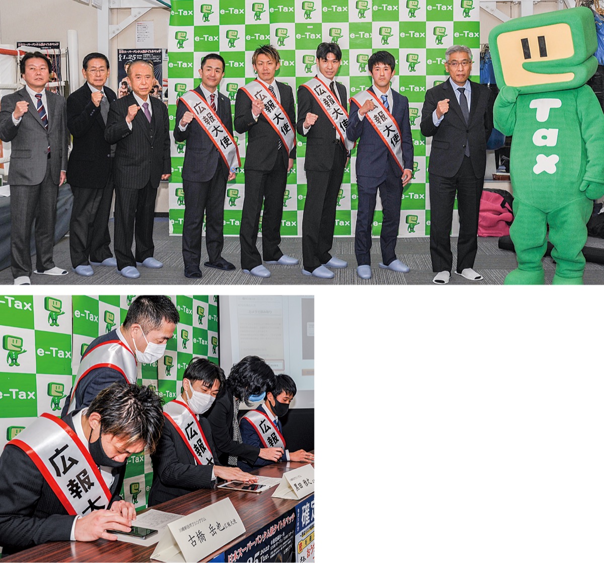 毎年恒例の取り組みで、今回は古橋・黒田両選手と、日本ユース・ミニマム級王者で中野島中出身の伊佐春輔選手(23)、新田渉世会長(54)が大使に。画面上で書類作成を体験した3選手は「スマホ一つで自宅でも簡単に操作できる」「確定申告で税務署は混むので、今の時代に合っている」など感想を口にした。大使の任期は1年で、確定申告や納税手続きがネットで可能な「e-Tax(イータックス)」の活用を呼びかけていく。