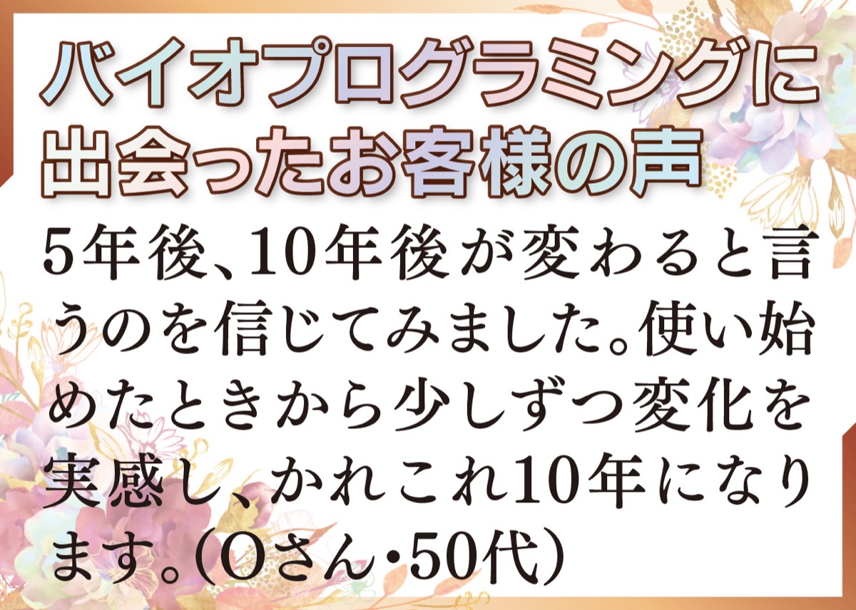 バイオプログラミングは人間の健康と美の可能性を引き出すことができます。あなた自身が持っている本来の才能を侮ってはいけません。髪、肌を通じてあなたが健やかに美しく若く輝き、人生がより豊かになるお手伝いをさせていただききます。もう迷わなくていいです。