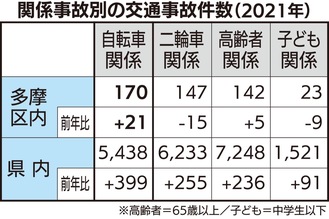 昨年1年間の多摩区の交通事故は前年比14件増の464件で、死者は1人減の2人。県内の交通事故は前年比1030件増の2万1660件だった。自転車関連の事故の割合は、県内では全体の25・1%だったのに対し、多摩区内は36・6%に上った。