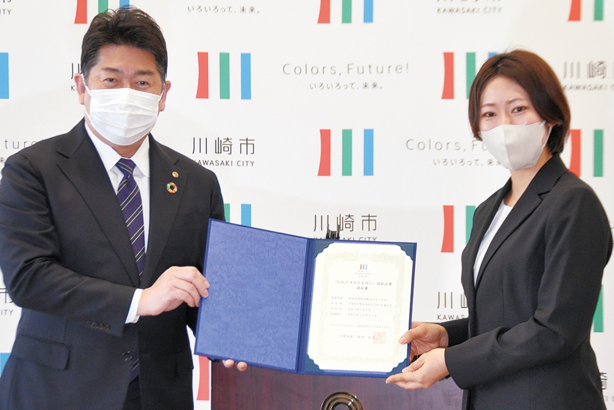 女性の活躍推進など柔軟な働き方を進める中小企業に対し、川崎市が認証する制度「かわさき・えるぼし」に、2021年度は26社が新たに認証され、18社が更新。多摩区内では、電気工事業の(株)アンテック(宿河原)と土木・水道施設工事の(株)シンヤ(宿河原)が新規認証を受け、建設業の(株)丸栄建設(長沢)が更新された。