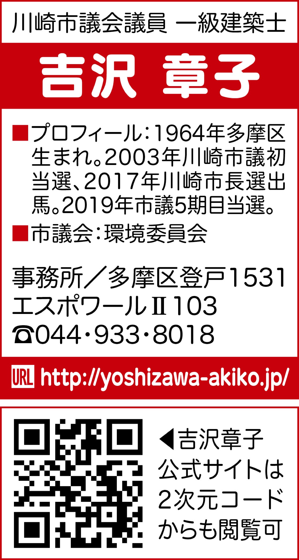 多摩区は水と緑。ふるさと多摩川の環境を守りつつ、人命を守る治水と水辺に親しむ利水によって、子どもからご高齢の方々まで多世代が安全に憩える素敵な河川敷となるよう、これからも皆さまとともに取り組んでまいります。皆さまのお知恵を是非、吉沢章子までお寄せください。