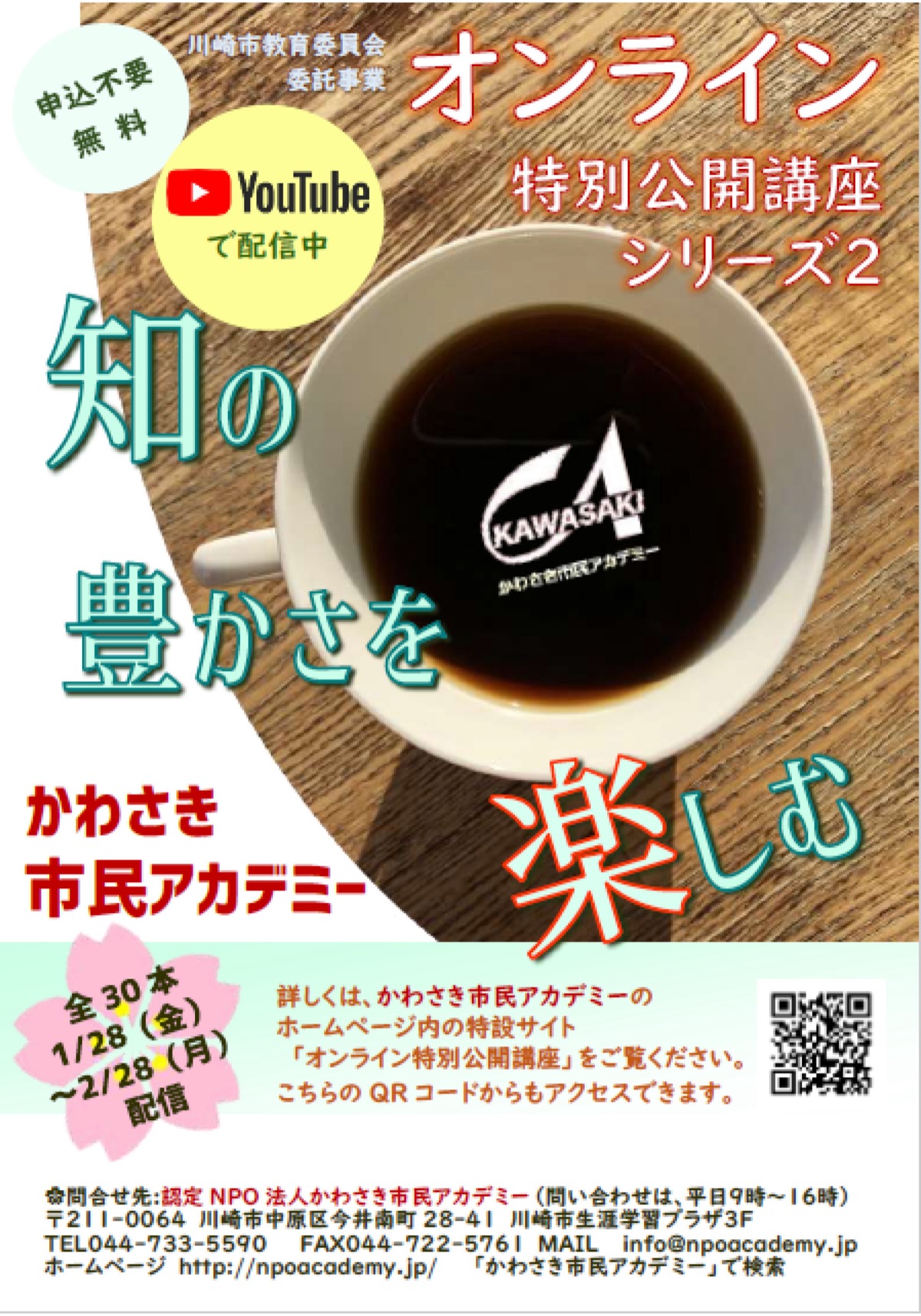 社会科学や自然科学など多分野にわたる講座を企画する「かわさき市民アカデミー」(藤嶋昭理事長)は、特別公開講座の動画を先月末から配信。2月28日(月)までユーチューブで無料視聴できる。
