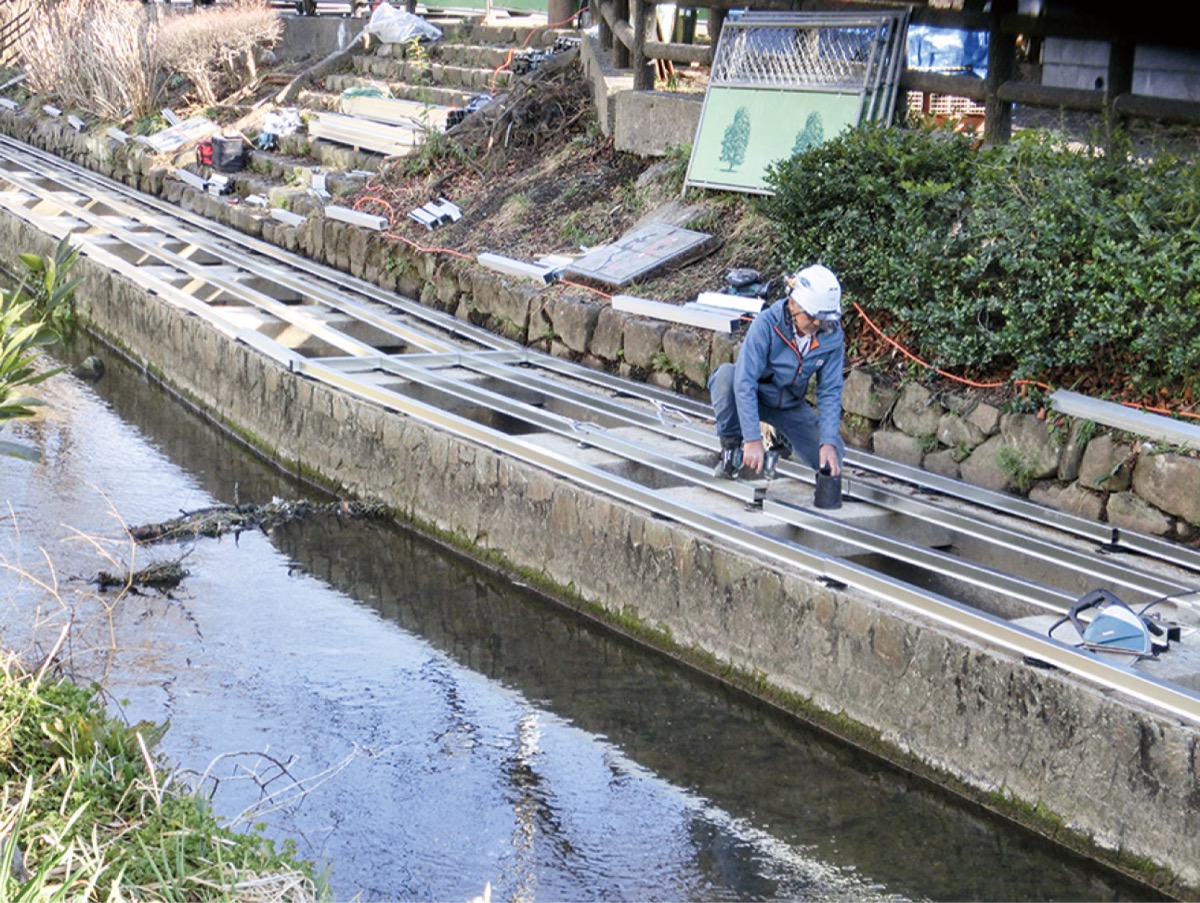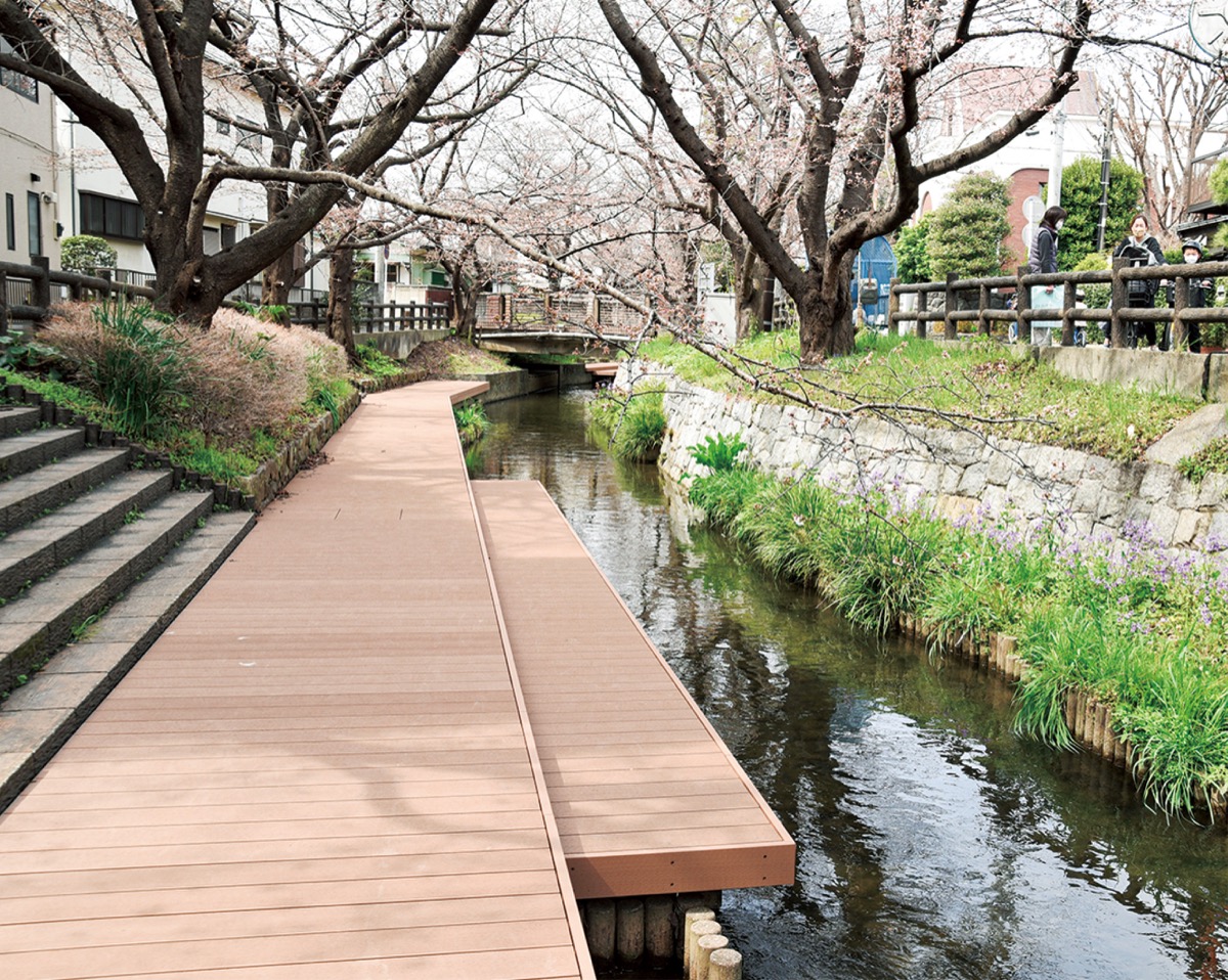 今年も見頃を迎えた桜の名所、二ヶ領用水宿河原線。水路沿いの遊歩道について、腐食・損傷した5カ所を対象に1月上旬から行われていた補修工事が今月完了した。多摩区役所道路公園センターは、今年度から5カ年計画で遊歩道の補修を順次進めていくという。