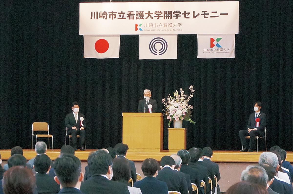 4年制の川崎市立看護大学(幸区/坂元昇学長)の4月開校に先駆け、市立看護短期大学講堂で3月26日、開学セレモニーが行われた。式典には福田紀彦市長や市議会議員、医療団体関係者、同大職員ら約120人が出席した。