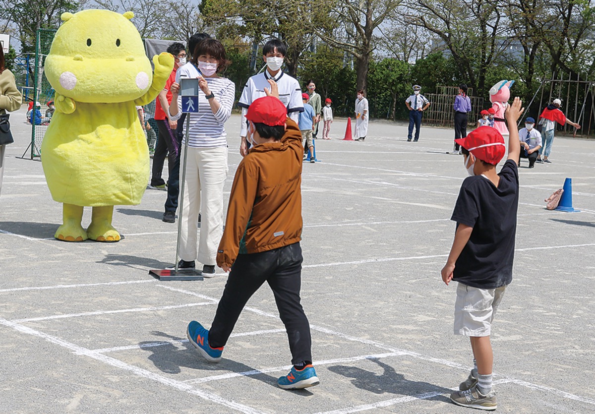 警察官はパネルを用いて説明した後、一緒に練習をする友達として、同社のマスコット「ヒッポちゃん」と県警のマスコット「ピーガルくん」「リリポちゃん」を紹介。児童は「わぁ、かわいい」と盛り上がりを見せ、マスコットたちに見守られながら、2人1組で横断歩道を渡る練習をした。
