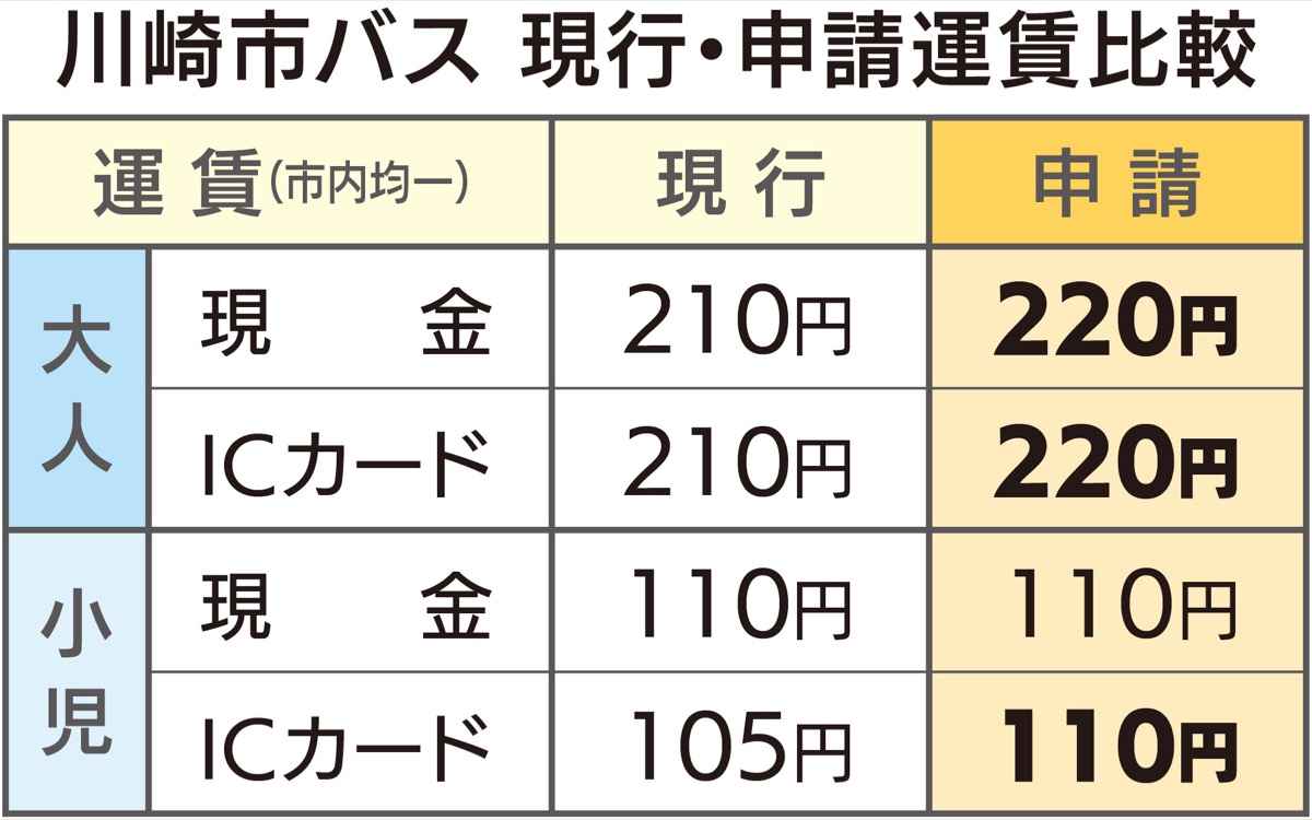 川崎市バスの運賃は1995年3月の前回改定以来、消費税率引き上げによるものを除いて変更していなかった。10月の改定では、大人の現金・ICカード運賃を210円から220円に、小児のICカード運賃を105円から110円に上げる。通勤定期も値上げするが、通学定期は子育て世代の経済的負担を軽減するため引き下げる。