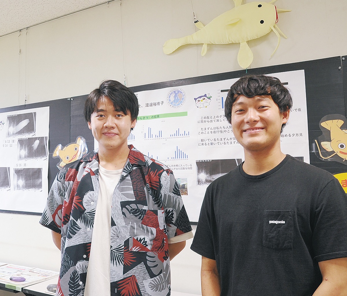 林さんらは今回、5月10日から16日までのたまずんの行動を記録。録画映像で水槽内の筒から出た回数を数え、夜間に激しく動いていることなどが分かった。展示では写真やグラフを使い、子どもにもわかりやすく解説。林さんは「研究室の小さいナマズに比べ(体長約70センチの)たまずんは暴れるというよりゆっくり。同じくらいの大きさのナマズとの行動の違いも調べてみたい」、中田さんは「いい勉強になった。結果を視覚化することで、あまり身近じゃない人にも伝われば」とそれぞれ語った。