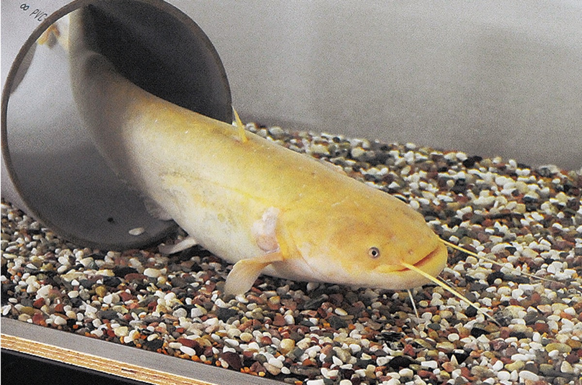 2年前に多摩川で捕獲され、現在は二ヶ領せせらぎ館(宿河原)の水槽で飼育されている黄金色のナマズ「たまずん」。先月、明治大学農学部生命科学科(生田キャンパス)の学生が、たまずんの行動を1週間・24時間にわたり赤外線カメラで観察した。この研究結果を6月30日まで、同館内で展示している。