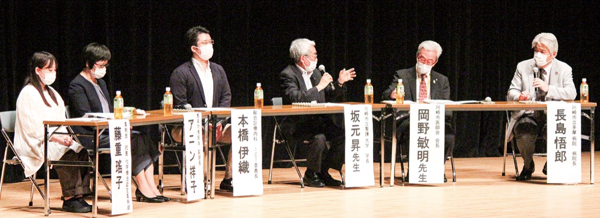 新型コロナの陽性患者を受け入れる重点医療機関として3年目を迎えた川崎市立多摩病院(長島梧郎病院長)は6月8日、多摩市民館でシンポジウムを開催。「検証〜新型コロナワクチン接種の問題点と今後を見据えて」と題し、医師や看護師ら6人がそれぞれの立場から意見を交わした。