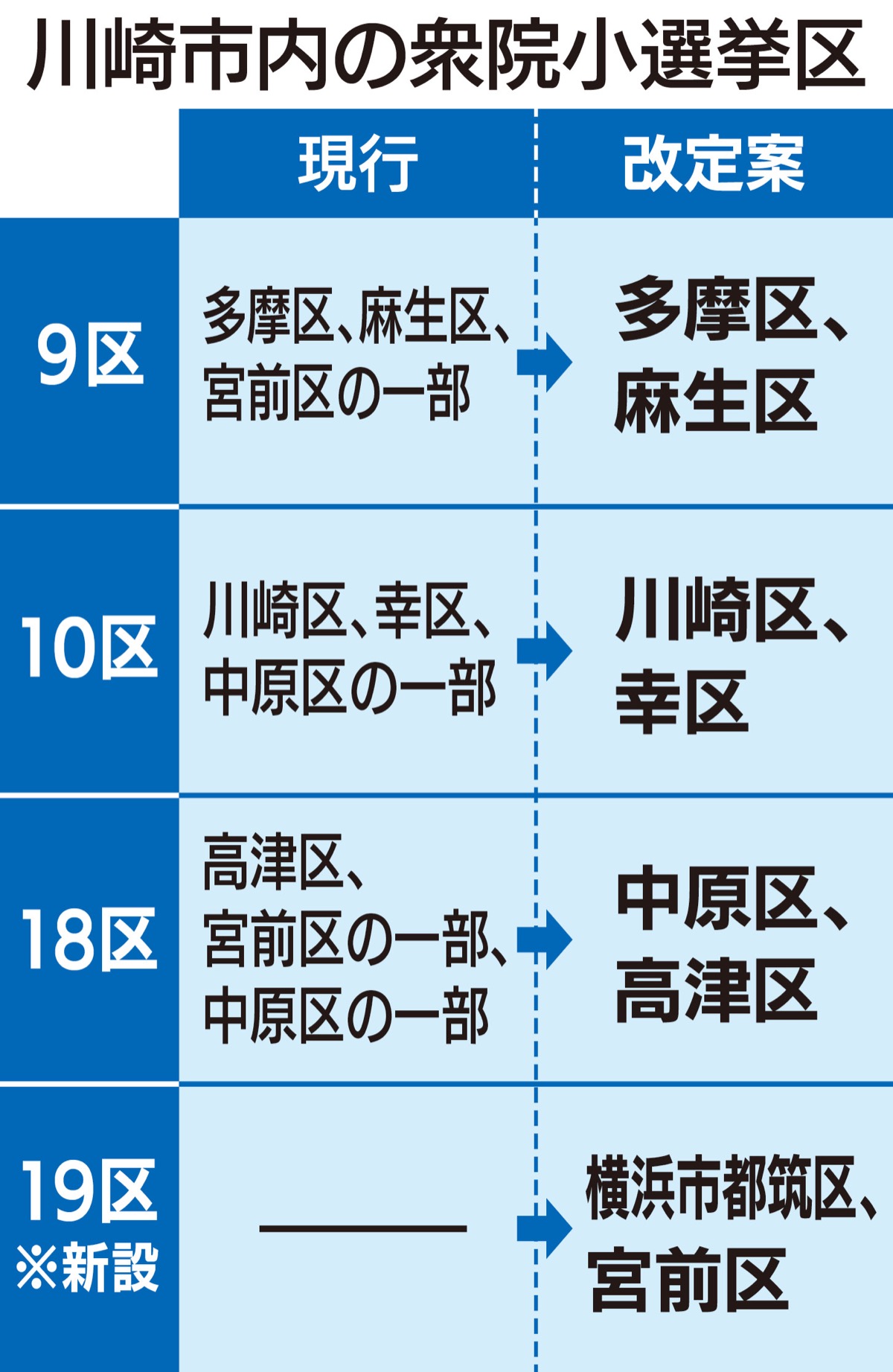 一人の議員が当選するために必要な得票数が選挙区によって異なり、有権者の一票の価値に格差が生じる「一票の格差」是正に向けた措置。川崎市内の区割り案では、10区と18区に分割されていた中原区が統合され、高津区と「新18区」にまとめられる。9区と18区に分割されていた宮前区は横浜市都筑区とで新設される「19区」になる。