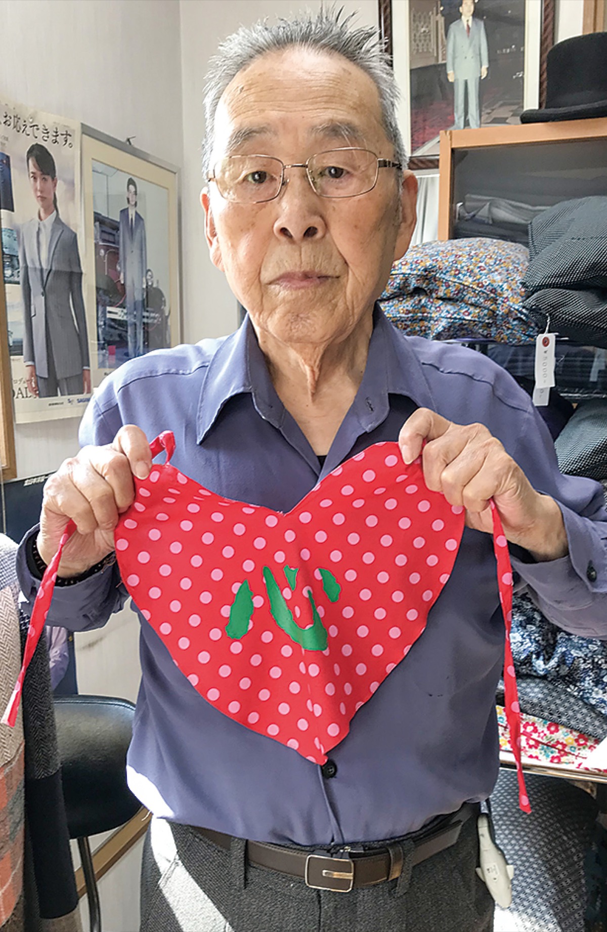 田中さんは徳島県生まれ。上京後、19歳からオーダーメイドの紳士服作り一筋の人生だ。「自分の培ってきた技術を生かそう」と前掛け製作を決意。布地をハート型に切り抜き、真ん中に「心」と文字を入れた。