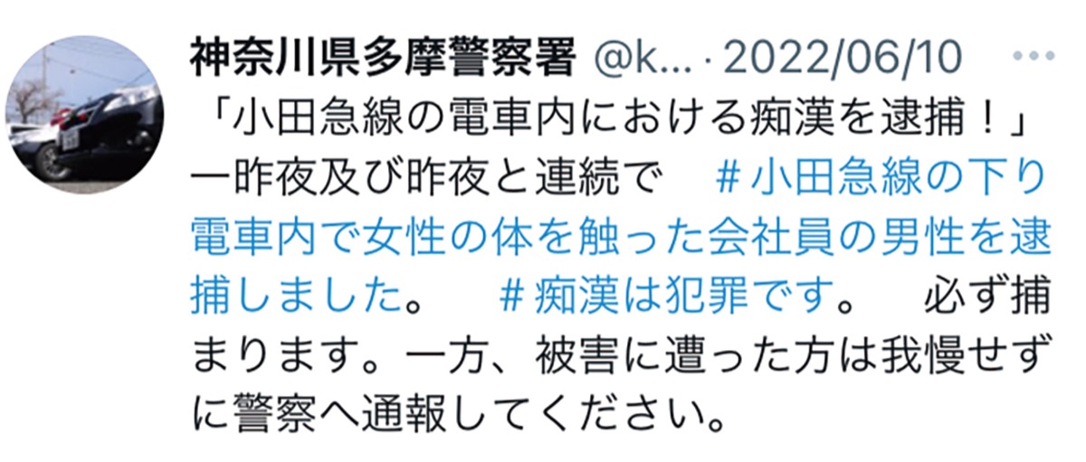 多摩署のツイッターでは6月10日、痴漢をした男性を逮捕したことを発信。「痴漢の被害に遭っても声に出せない女性がいる。ためらわずに、駅員や警察に通報して」と同署。今後も痴漢被害の発生状況を積極的に発信し注意を呼びかける。
