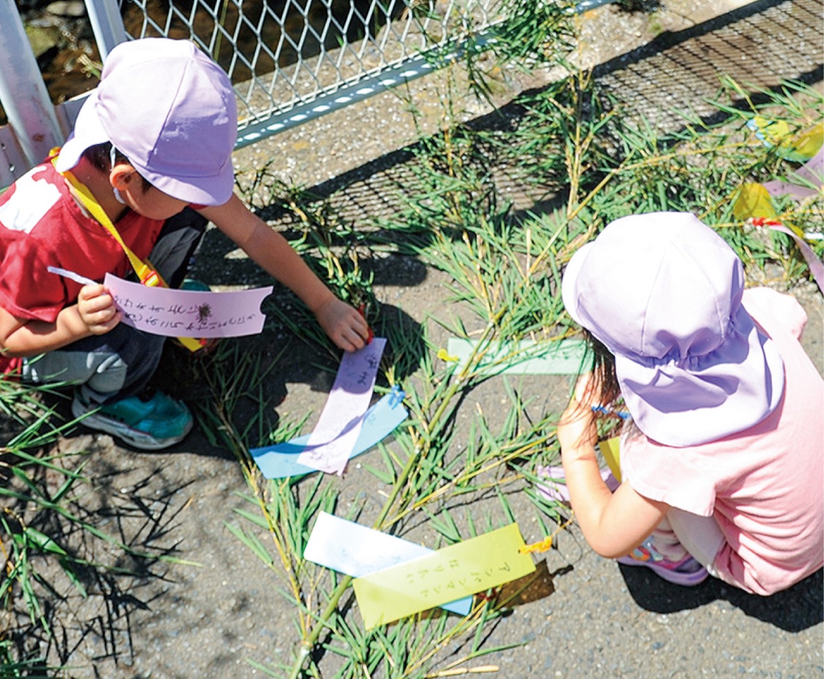 地域の子どもたちを思い、2010年から毎年続く活動。13年目の今回は自治会員のほか、市立東生田小学校の4年生150人ほどが短冊を用意。近隣5カ所の保育園からも約200枚の短冊を集めた。設置当日も園児や通りがかりの親子が参加。川沿いの柵の笹竹に付けられた短冊には、「世界が平和になりますように」「笑顔で一年過ごせますように」など、さまざまな願い事が書かれていた。