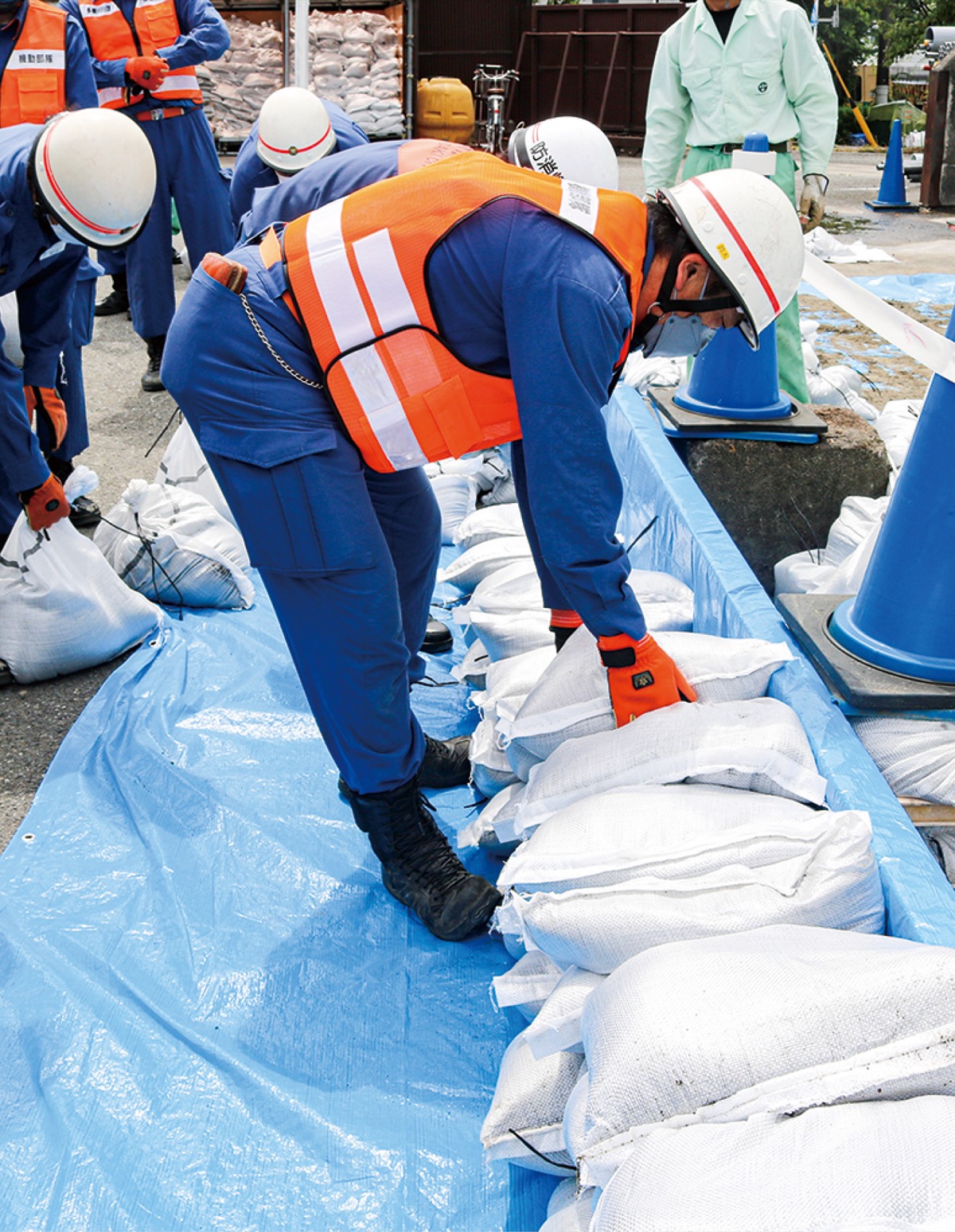 区道路公園センターの職員は、署員と消防団員に土のうの作り方や積み方を指導。水の流入を防ぐ積み方として、ブルーシートで包んだはしごの前に土のうを並べた。堤防の崩壊を防ぐために斜面にブルーシートを取り付ける「シート張り工法」も実践した。