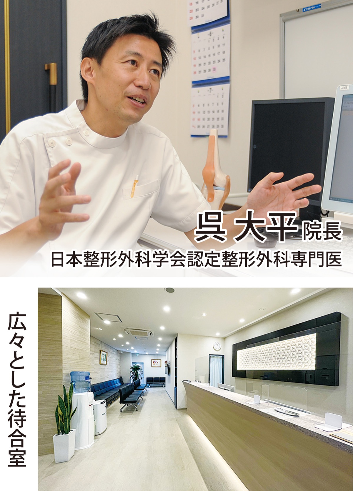 東大卒でIT業界に7年半勤めた後、医者を志して琉球大医学部に進んだ異色の経歴を持つ呉院長。医師としては東邦大など大学病院で経験を積んだ。健康な日常生活の支えとなれる運動療法に関心を抱き、日本整形外科学会認定の整形外科専門医に。「健康寿命の延伸を考えたとき、運動器疾患の予防と治療、リハビリは非常に重要」と呉院長。「些細なことでも気軽に相談できる存在として、『僕がなんとかする』という気持ちで患者さんの悩みに寄り添う。ぜひ困った人の力になりたい」と、地域医療への強い思いを語る。