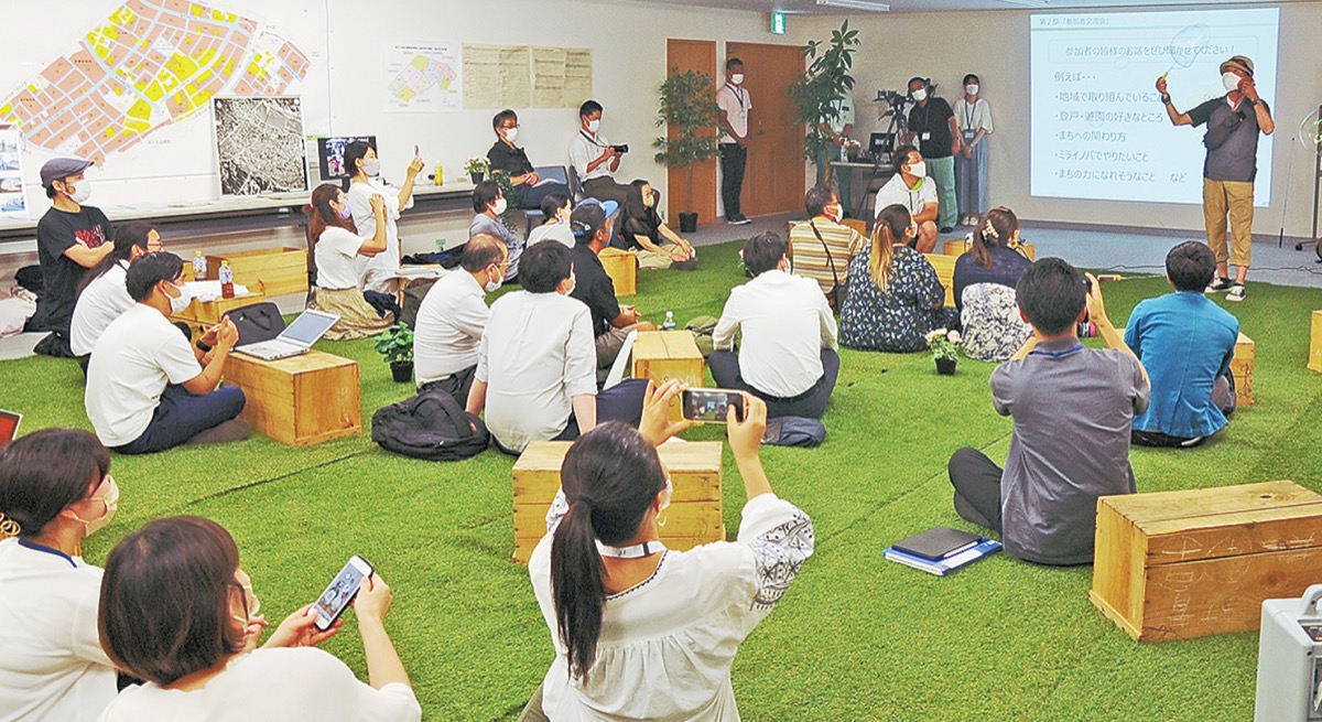 今回、「まちに開かれた会議」として区画整理事務所で初開催されたオープンミーティングには、事務局を含め約50人が参加。ミライノバの説明や協力団体・企業の活動紹介、参加者交流会が行われ、芝生調のゆるやかな空間で思いを交わした。