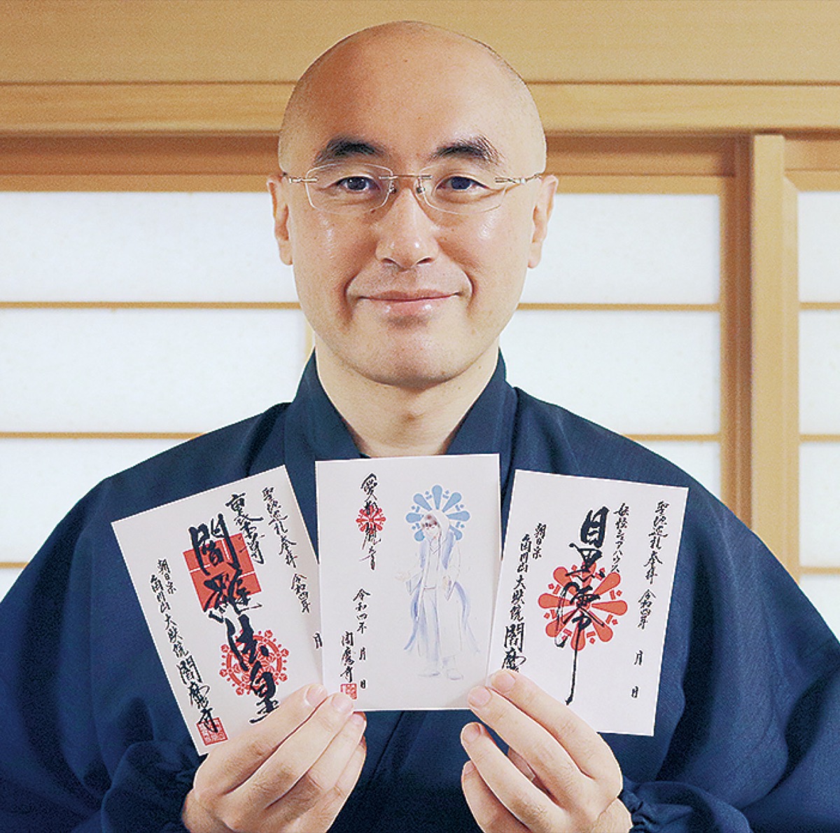 作家志望の主人公・澪の御朱印は筆の形をした「筆形輪宝紋」、酒好きの鬼・酒呑童子(しゅてんどうじ)はとっくりが描かれた「瓶子紋」を使用。閻魔大王は安立寺が日蓮宗であることから「閻羅法皇」とし、気性の荒いキャラクターを表そうと行書を用いた。今月追加した新たな御朱印は、天才数学者役のAITOのイラスト付き。「澪とAITOは恋に落ちる設定。だから書体と御朱印は同じに」と細部までこだわりがある。