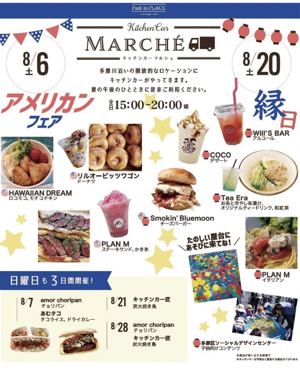 週末(第1・3土曜日、毎週日曜日)には、駐車場を利用して、誰でも参加できる「キッチンカーマルシェ」を開催中。第1・3土曜日は最大5台、毎週日曜日は2台のこだわりキッチンカーが出店中。マルシェ開催日は、ドリンク購入で2時間までスペースの利用が可能。キッチンカーで購入した食事も持ち込める。8月は縁日企画など、老若男女が楽しめるマルシェになるよう工夫をこらす。企画・運営は中野島のパン屋「パントレプレナー」が協力。8月中のマルシェでは「タウンニュース見た」で同店冷凍パンを贈呈(1人1つ)。今後、物販や地域を盛り上げる企画も行っていく。最新情報は公式インスタグラムから。