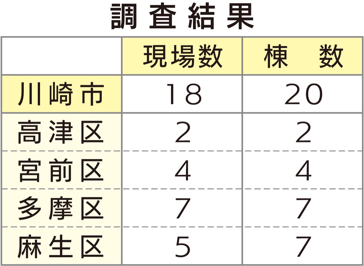 管轄する国土交通省から情報提供のあった市の調査対象は、20現場・57棟。市は4月から国や関係特定行政庁と協議を進め、建築基準法の規制対象部位への使用の有無とJIS規格への適合調査を実施。7月上旬には、建築基準法37条に抵触する建築物が18現場・20棟であると特定した。そのうち多摩区と麻生区が最多の7棟、次いで宮前区の4棟、高津区の2棟と続いた。